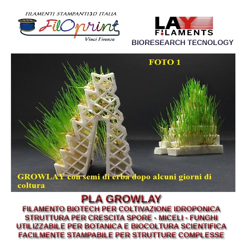 Il filamento GROWLAY da FILOPRINT commercializzato nella sola versione BROWN, può essere utilizzato per l'agricoltura indoor. Gli strati di GROWLAY possono produrre strutture organiche. Semplicemente aggiungendo dell'acqua, semi o spore di qualsiasi tipo di pianta esse cresceranno sul filamento, permettendo una biocoltura ed una crescita organica controllabile e gestibile come CASE STUDY di ricerca.
